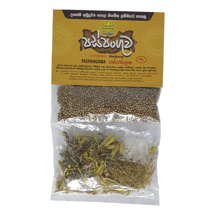 Sethsuwa Paspanguwa (50g) is a traditional Sri Lankan herbal blend made from a combination of five carefully selected herbs, reflecting centuries of Ayurvedic knowledge. Known for its warm and soothing properties, this blend is perfect for preparing a comforting herbal drink. Easy to use, Sethsuwa Paspanguwa is ideal for those who appreciate authentic, natural remedies and the rich traditions of Sri Lankan herbal wellness.