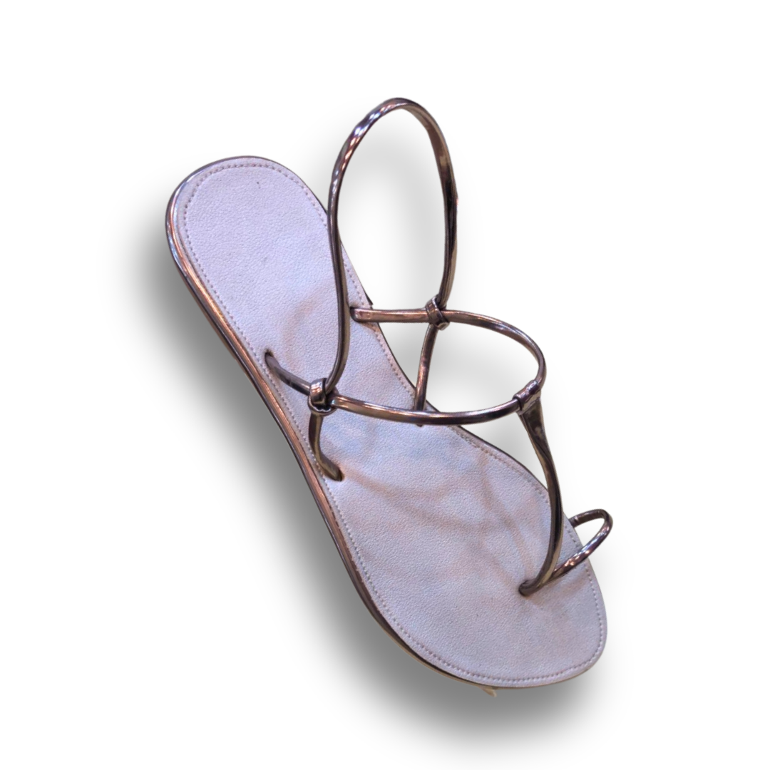 Step into effortless sophistication with these flat metallic strappy sandals. Designed with a minimalist yet eye-catching style, they feature durable straps and a comfortable sole, making them perfect for casual wear or evening outings. Available in three versatile colors: Gold, Silver, and Black. Add a touch of glam to your wardrobe today.